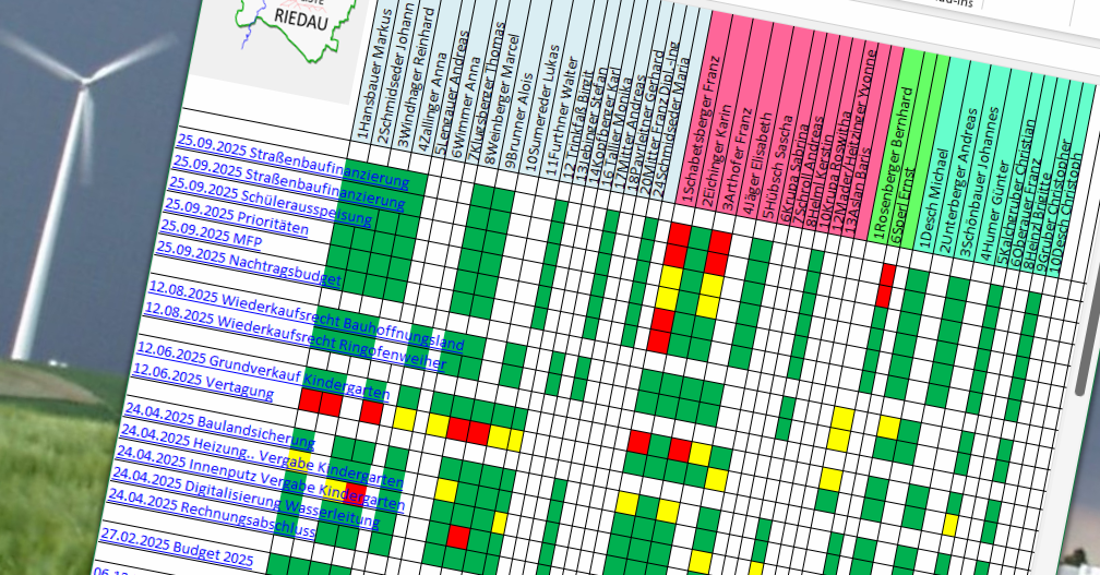 Das Protokoll dieser Gemeinderatssitzung umfasst 292 Seiten mit vielen personenbezogenen Daten, die zu schwärzen wären. Daher werden hier nur die ersten 8 Seiten zur Verfügung gestellt. Mit dem seit 1.9.2025 geltenden Informationsfreiheitsgesetz kann jede/r eine (elektronische) Abschrift des Protokolls anfordern. Wie bisher ist auch für jede/n die Einsicht in das Protokoll am Gemeindeamt möglich.